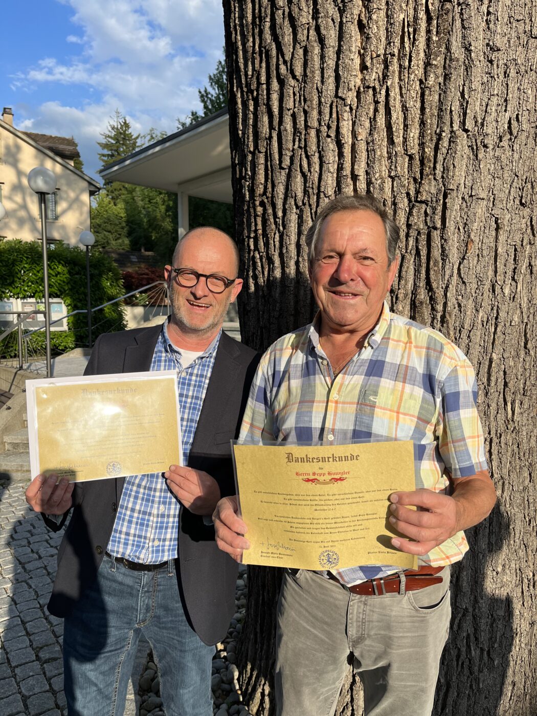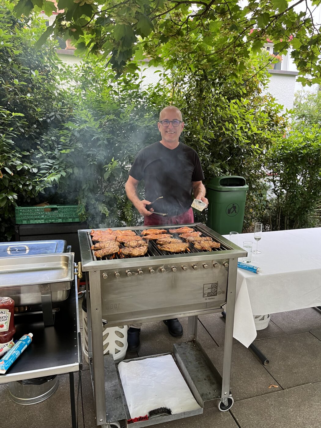 Bunte Lämpchen sorgten für ein gewisses Piazza Feeling. Kurt Regattieri von der Metzgerei Seefeld stand hinter dem Grill und verstand es feine gebratene Würste und Steaks auf die Teller zu zaubern. Dazu gab es vom Pastoralteam frisch zubereitete Salate und danach ein reichliches Dessert Buffet. Aber beginnen wir beim Apéro. Pfarrer Liviu und Vize-Präsident der Kirchenpflege Stephan Oetterli begrüssten die Anwesenden. Eine Neuheit am diesjährigen Helferfest war eine Dankesurkunde für die geleisteten Dienste an der Gemeinde von Bischof Bonnemain höchstpersönlich unterschrieben. Pfarrer Liviu überreichte diese an Sepp Huwyler und Benedikt Näf. Eine schöne Geste und wir sind gespannt, wer wohl nächstes Jahr eine solche Urkunde erhalten wird.